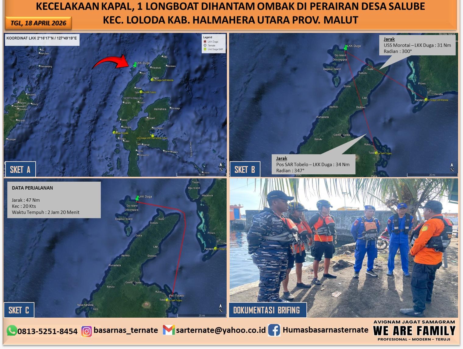 R24, Halut-Sebuah longboat dengan jumlah POB 8 orang dilaporkan terbalik dan tenggelam di perairan desa Salube tepatnya depan Selat Lebeno, Kab. Halmahera Utara, Provinsi Maluku.